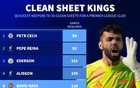 英超俱乐部最快达成50场零封门将前10:切赫第1,拉亚第5