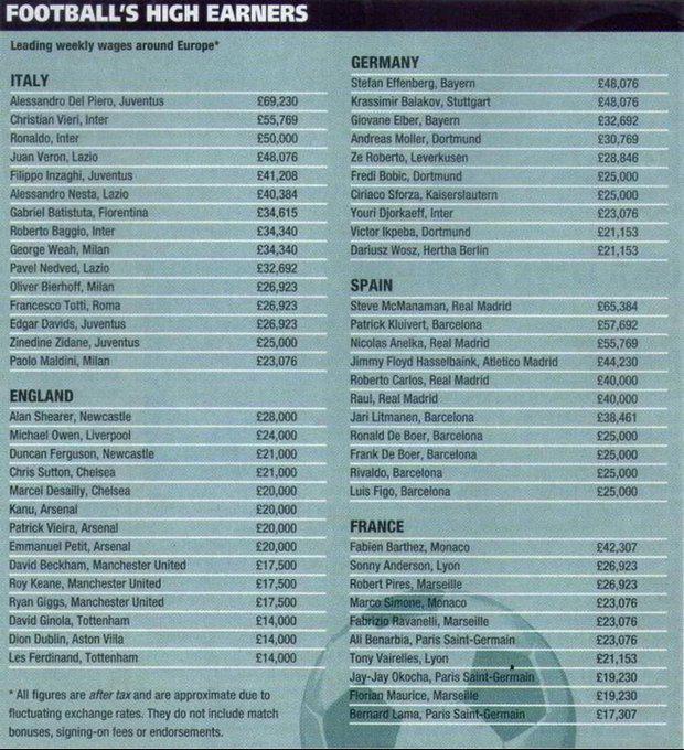 欧洲90年代周薪排行榜,那时候球员收入就已经很高